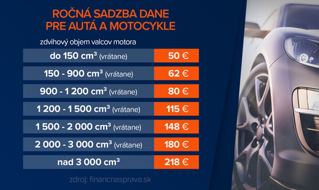 Celé Slovensko používa jednotné sadzby, čiže nie podľa toho, v akom kraji je evidované motorové vozidlo. Do zdanenia spadajú aj niektoré nové kategórie ako štvorkolky, trojkolky, elektrické skútre. Všetko podrobnosti nájdete na stránke finančnej správy.
