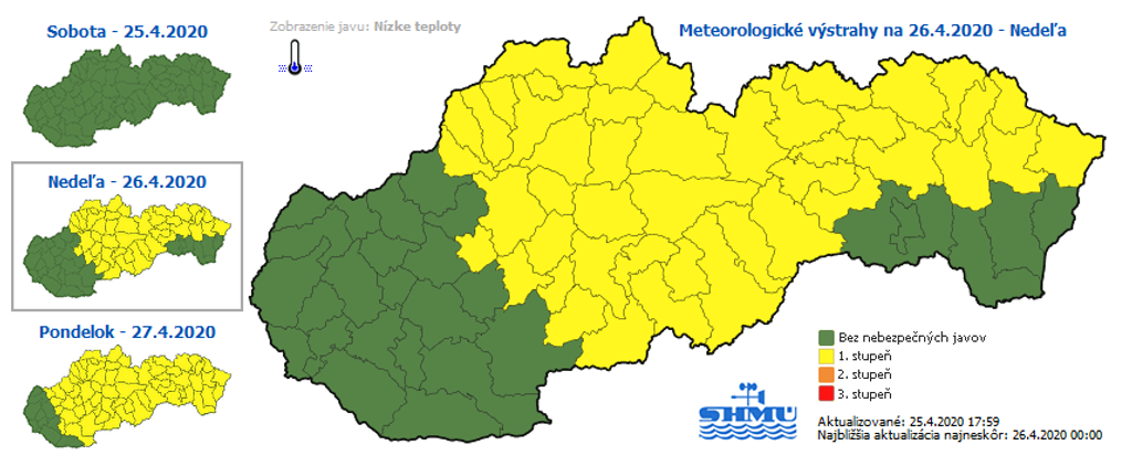 Výstrahu prvého stupňa pred nízkymi teplotami vydali meteorológovia pre niektoré okresy Banskobystrického, Trenčianskeho, Košického, Prešovského a Žilinského kraja. V týchto lokalitách sa očakáva dosiahnutie minimálnej teploty vzduchu do mínus štyroch stupňov Celzia. SHMÚ upozorňuje, že mráz predstavuje nebezpečenstvo pre teplomilné rastliny. Výstraha platí od polnoci do 8.00 h.