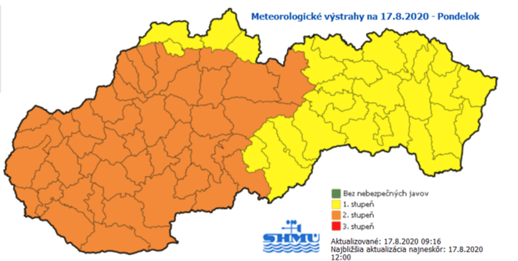 Meteorológovia vydali výstrahu druhého stupňa, ktorá platí pre západné a časť stredného Slovenska od 11.00 h do polnoci. Pre východné Slovensko a časť stredného platí výstraha prvého stupňa od 11.00 h do polnoci.