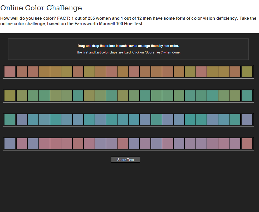 Farebné okienka zoraďte za sebou podľa odtieňov farieb pomocou kliknutím a ťahaním. Krajné okineka zostávajú na mieste. Po dokončení testu kliknite na okienko "Score Test". Čím menšie skóre dosiahnete, tým vidíte lepšie.