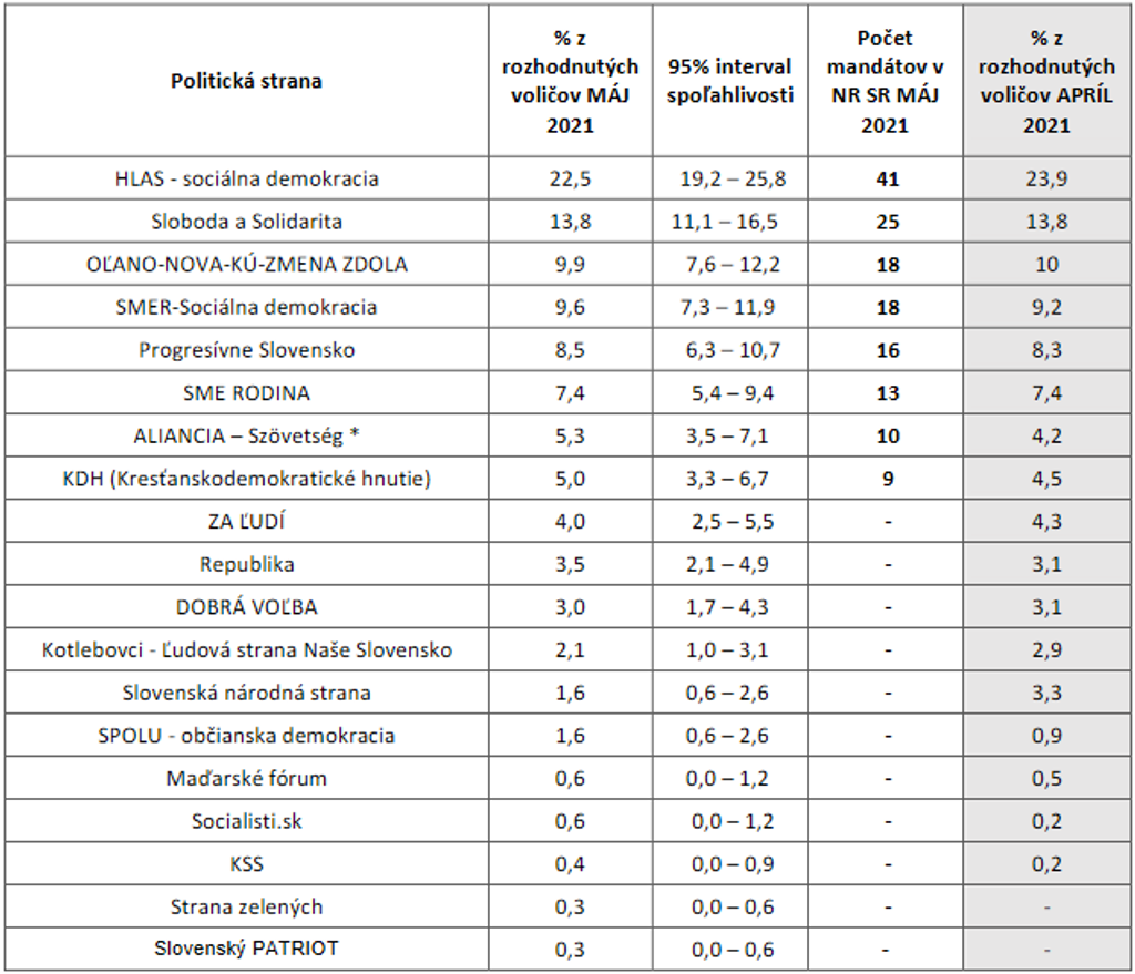 DO NR SR by sa už nedostala koaličná strana Za ľudí (4%), odídenci z ĽSNS, ktorí založili stranu Republika (3,5%) a ani Dobrá voľba (3%). Ostatné strany by nezískali ani tri percentá hlasov.