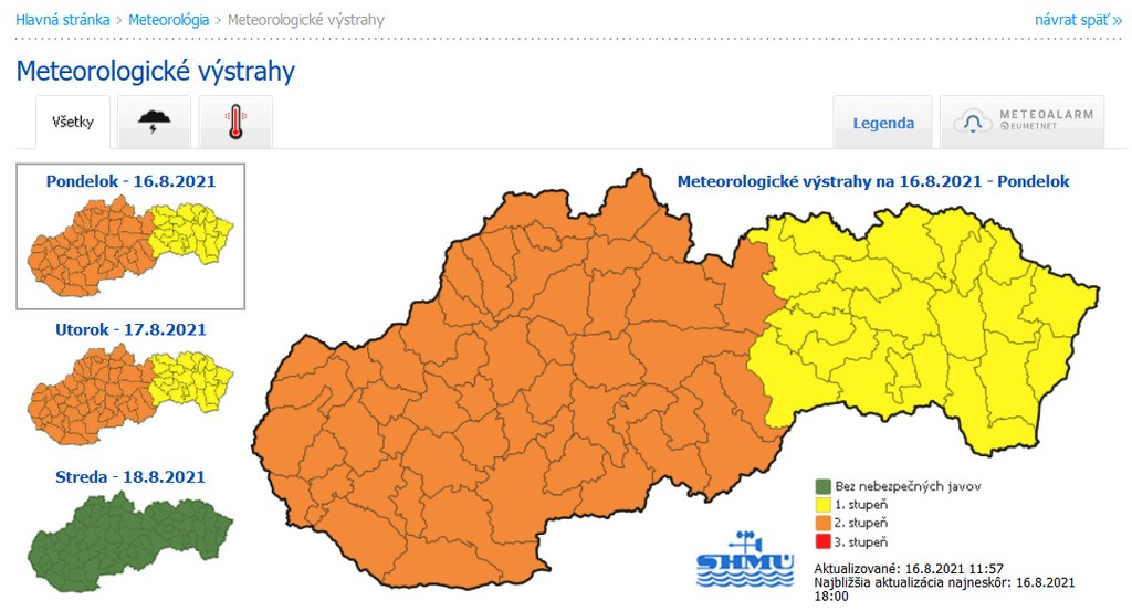 Druhý stupeň výstrahy platí od 18.00 h až do utorka (17. 8.) rána. S búrkami môžu byť spojené prívalové zrážky s úhrnmi 30 až 50 milimetrov a nárazy vetra s rýchlosťou 70 až 110 kilometrov za hodinu, upozornili meteorológovia s tým, že pravdepodobnosť spôsobenia škôd je vysoká.