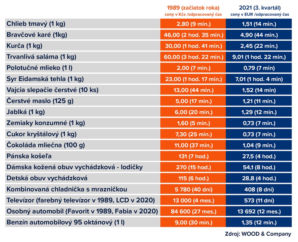 Porovnaním priemerných nominálnych miezd (v roku 1989 na úrovni 3 142 Kčs a v prvom polroku 2021 na úrovni 1 163 EUR) a cien konkrétnych produktov môžeme zjednosušene vyjadriť, koľko času museli Slováci odpracovať na kúpu vybraných tovarov pred vyše tridsiatimi rokmi a koľko v súčasnosti.