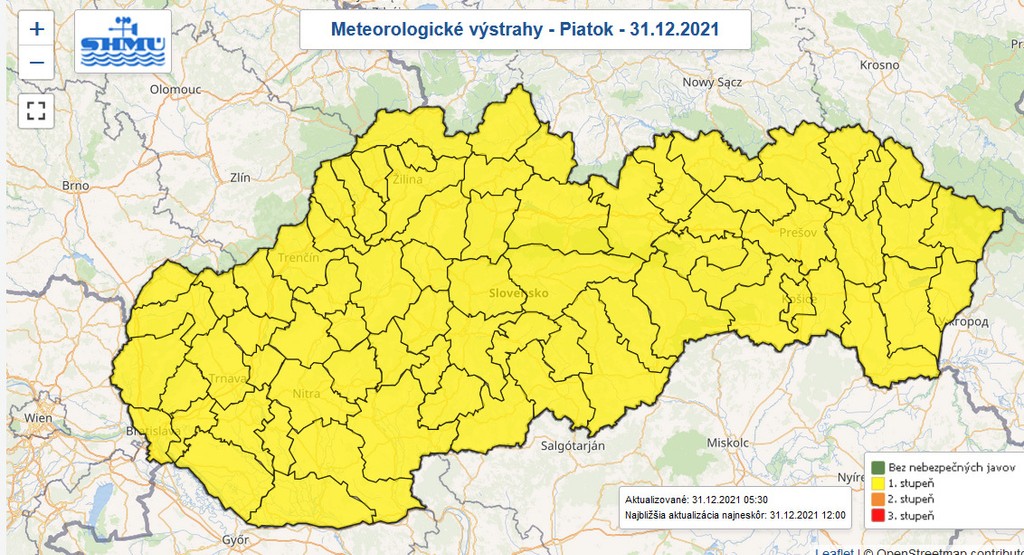 Posledný deň v roku 2021 potrápi celé územie Slovenska hmla. Slovenský hydrometeorologický ústav vydal v tejto súvislosti výstrahu prvého stupňa pre takmer celé územie krajiny, pričom trvá do polnoci.