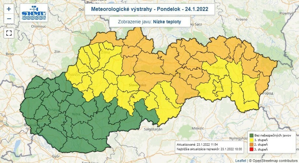 Počas nasledujúcej noci, z nedele na pondelok (24. 1.), sa v horských oblastiach ochladí na mínus 21 stupňov Celzia. V noci z pondelka na utorok (25. 1.) by predbežne malo byť mínus 23 stupňov Celzia. Uvádza to Slovenský hydrometeorologický ústav (SHMÚ) na sociálnej sieti.