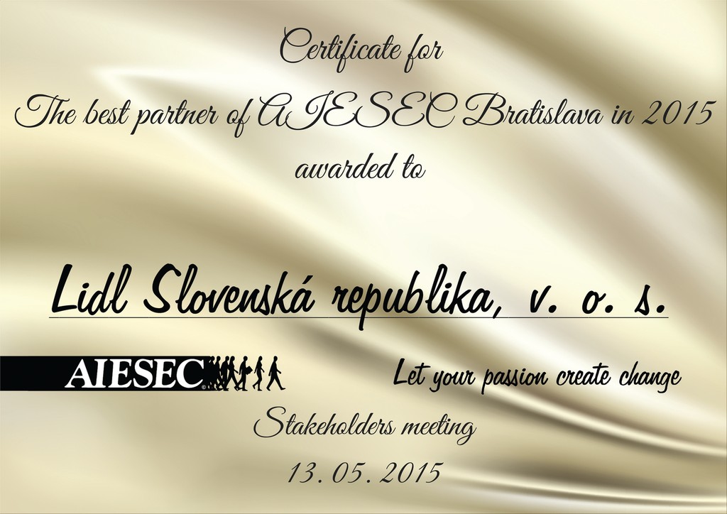 „Spoločnosť Lidl Slovenská republika, v.o.s. sme si vybrali za najlepšieho partnera roka 2015 z viacerých dôvodov. Práve s Lidlom sme v danom období najviac rozšírili spoluprácu, ktorá tak nadobudla naozaj široký rozmer. Spolupracovali sme napríklad v súvislosti s dvoma národnými konferenciami, NDK - Festivalom kariéry, ako aj pri iných projektoch," uviedla Veronika Drábiková z AIESEC Bratislava a dodala: „Túto spoluprácu si veľmi vážime. Vďaka poskytnutým finančným prostriedkom sa mohlo približne 60 mladých ľudí vzdelávať v praxi."