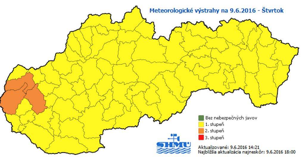 Výstrahu pred búrkami vydal Slovenský hydrometeorologický ústav (SHMÚ) pre celé Slovensko. Väčšiny územia sa týka prvý stupeň výstrahy, v okresoch Malacky, Senica a Trnava je to až druhý stupeň. Výstrahy platia do večera.