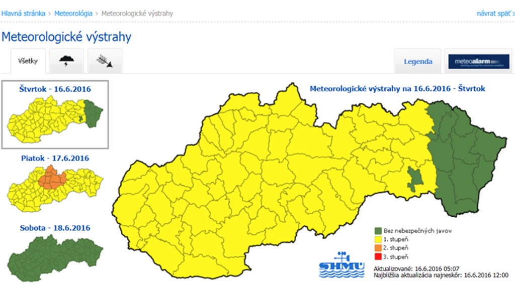 Na veterné počasie upozorňuje SHMÚ aj v piatok. Opäť sa môžu objaviť prehánky a búrky. Najvyššia denná teplota 25 až 30, na juhovýchode až okolo 32 stupňov. Fúkať bude prevažne južný vietor 15 až 35 km/h, v nárazoch miestami okolo 60 km/h, večer bude postupne slabnúť. Na horách očakávame búrlivý vietor až víchricu.