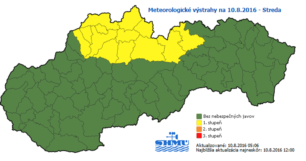 Meteorológovia aj dnes varujú pred búrkami. Výstrahu prvého stupňa vydali pre sever Slovenska. Informuje o tom Slovenský hydrometeorologický ústav (SHMÚ) na svojej webovej stránke.