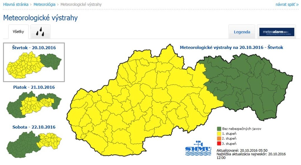 Vo štvrtok 21. októbra bude na väčšine územia Slovenska výrazne daždivé počasie. Okrem východu vydal Slovenský hydrometeorologický ústav (SHMÚ) pre ostatné územie počas celého dňa výstrahu pred dažďom prvého stupňa.