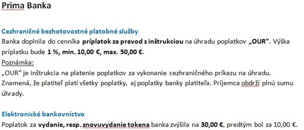 Do cenníka banka doplnila príplatok za prevod s inštrukciou na úhradu poplatkov za vykonanie cezhraničného príkazu.