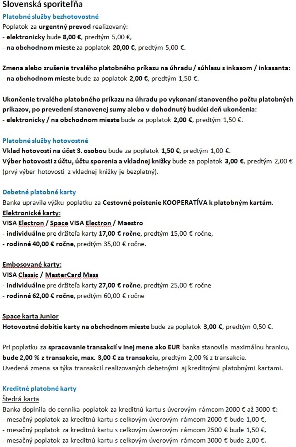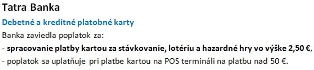 Banka upravuje viaceré poplatky za platobné aj bezhotovostné služby.