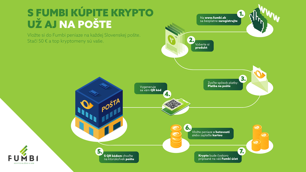 Vo Fumbi si môžete bezpečne, jednoducho a efektívne sporiť s kryptomenami. Táto možnosť je teraz ešte bližšie k ľuďom. Spraviť vklad môžu na každej pobočke Slovenskej pošty. Fumbi má už vyše 100 000 používateľov a rozšírilo sa mimo Slovenska aj do Českej republiky, Maďarska a Poľska. Doteraz mohli používatelia vkladať financie do produktov prostredníctvom bankového prevodu, platby kartou a Rýchleho vkladu, teraz sa k spôsobom pridáva novinka - Platba na pošte. Stačí si pri spôsobe platenia vybrať tento spôsob platby a s vygenerovaným QR kódom zaplatiť na ktorejkoľvek pobočke Slovenskej pošty kartou alebo v hotovosti.