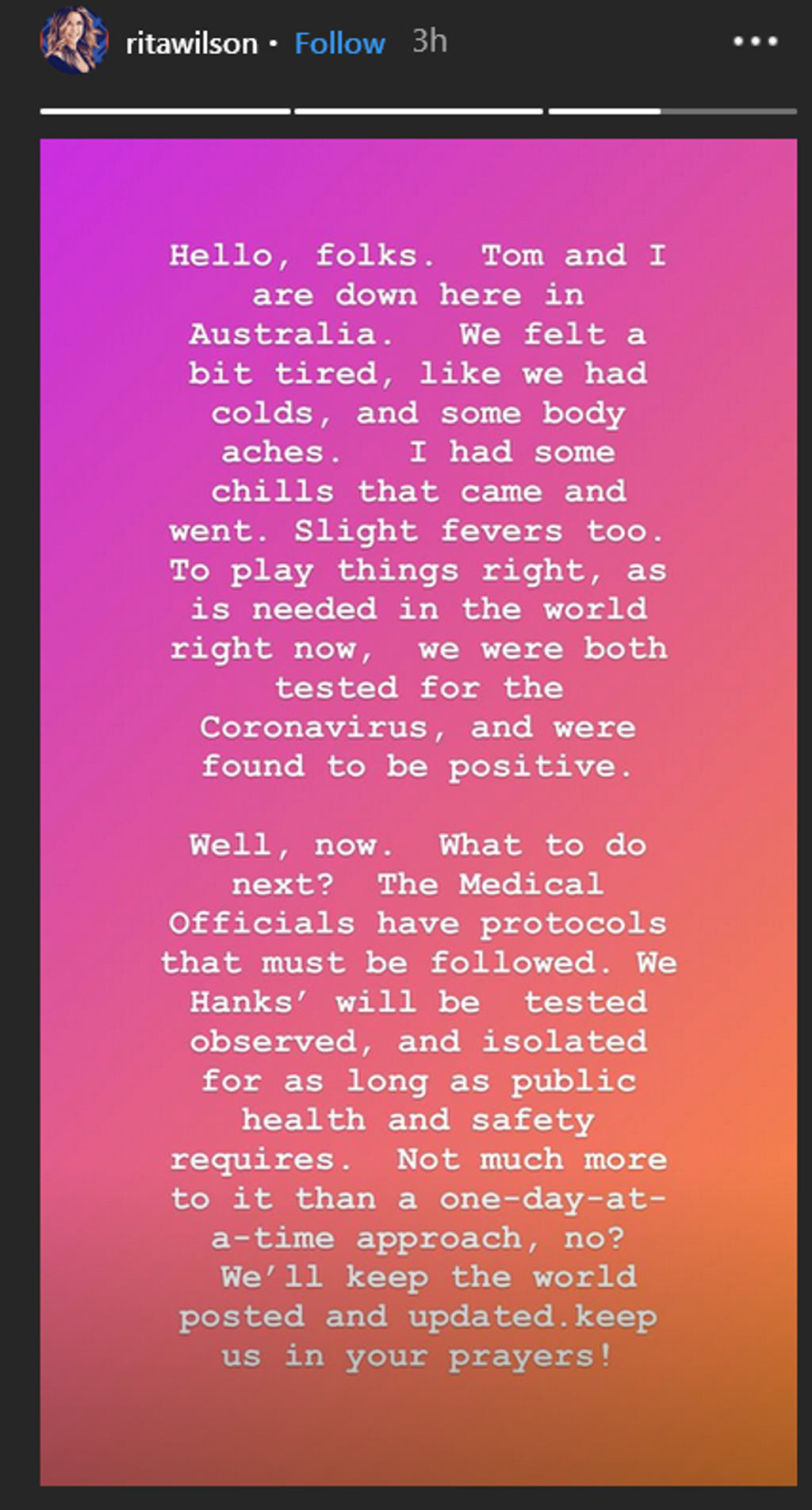 koronavírus, a testy nám vyšli pozitívne," napísal 63-ročný Hanks v