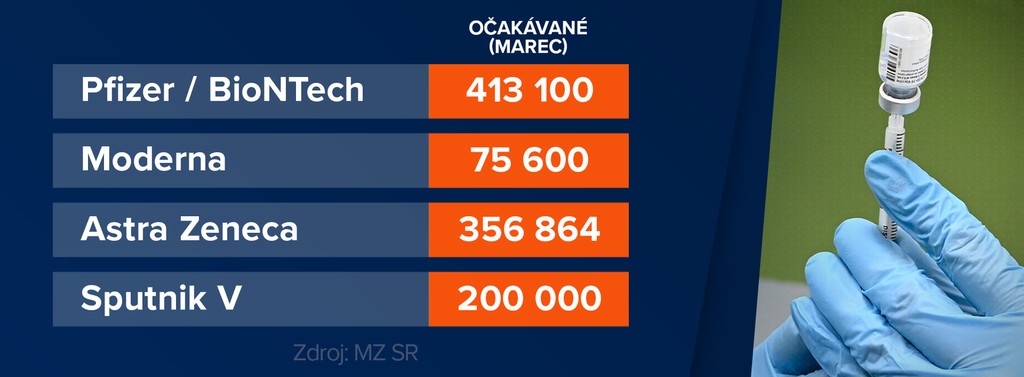 Krajčí informoval, že Slovensko v marci očakáva od Pfizeru 413 100 kusov vakcín, od Moderny 75-tisíc, od AstraZenecy 356 864 kusov a aktuálne už máme v sklade aj 200-tisíc dávok vakcíny Sputnik V. Premiér Igor Matovič avizoval, že Francúzsko nám daruje 15-tisíc kusov vakcíny AstraZeneca.