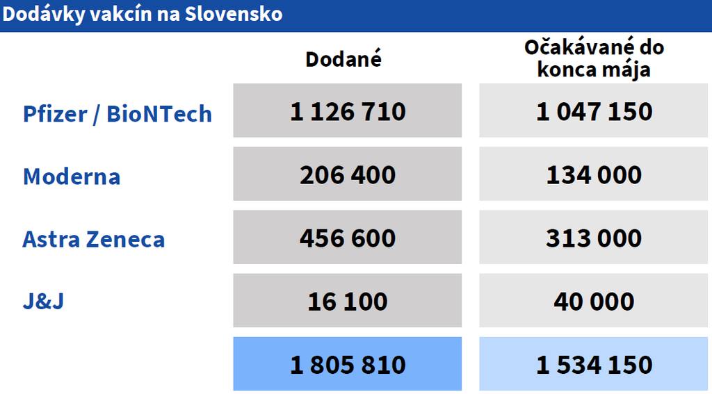 Do konca mája je na Slovensko plánovaná dodávka vakcín v celkovom objeme 1 534 150. Najviac by malo byť od konzorcia Pfizer/BioNTech. Od tohto výrobcu by malo byť dodaných 1 047 150 vakcín.