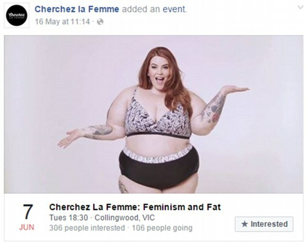 Austrálska skupina Cherchez La Femme vytvorila pozvánku na sociálnej sieti ku konferencii na tému Feminizmus a obezita. Tvárou projektu bola modelka Tess Holliday (30). Organizátori vybrali ako úvodnú snímku jej fotku v bikinách. Facebook okamžite reagoval a pozvánku stiahol. Podľa nich totiž porušuje štandardy zdravia a zdravotného životného štýlu.