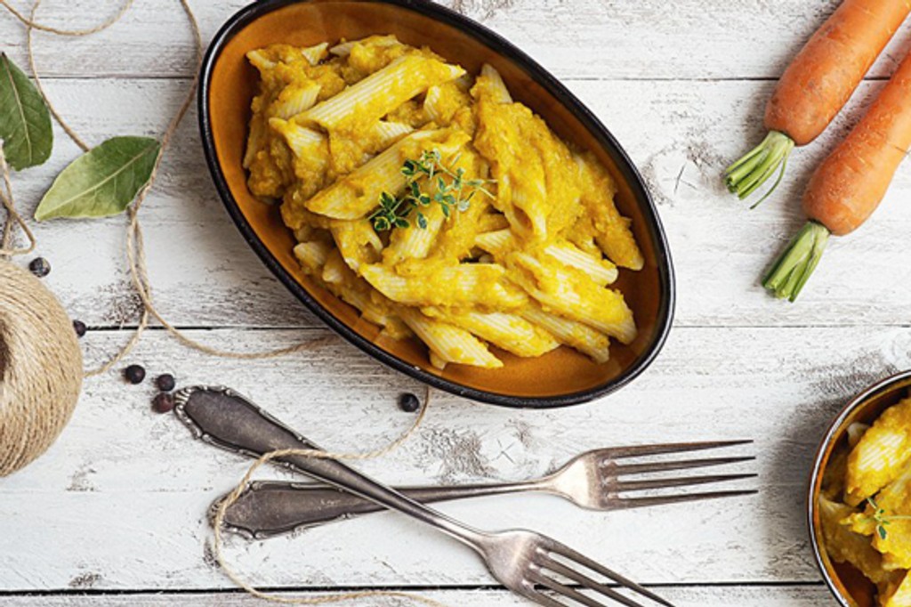 Semolínové penne s mrkvovo-pórikovou omáčkou