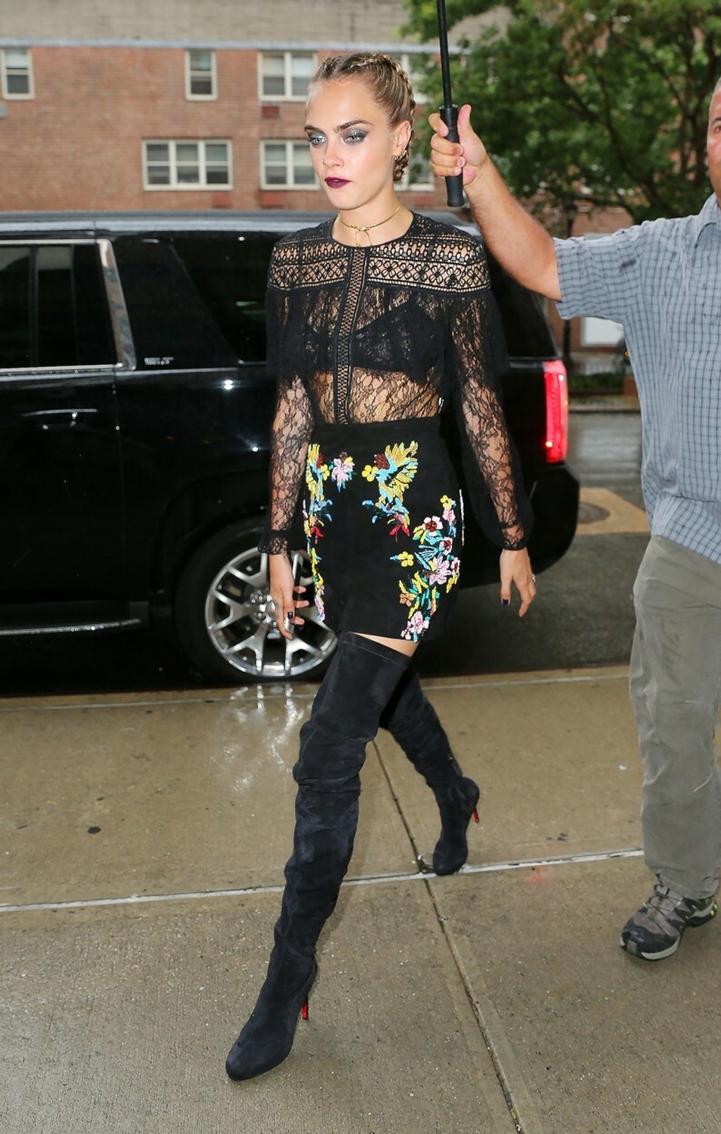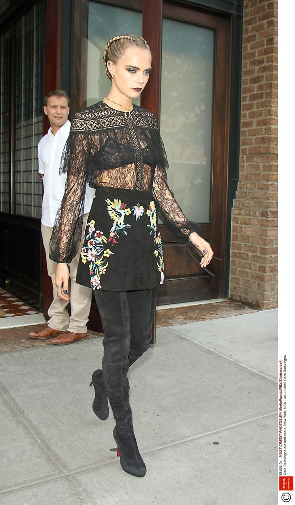 Najnovšie ohúrila v uliciach New Yorku. Cara mala oblečenú presvitnú čiernu blúzku, spod ktorej bolo vidieť elegantnú podprsenku, sukňu s vysokým sedom s vyšívaným vzorom a semišové čižmy vysoké až po stehná.