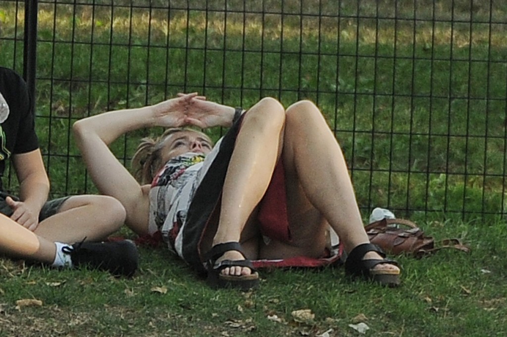 Herečka mala na sebe voľné dlhé šaty a cítila sa tak uvoľnene, že si bez problémov ľahla na trávu a rozkročila nohy. Neuvedomila si, že ju sledujú bulvárni fotografi, ktorí si tento moment pozabudnutia nenechali ujsť a cvakali spúšťami ostošesť.