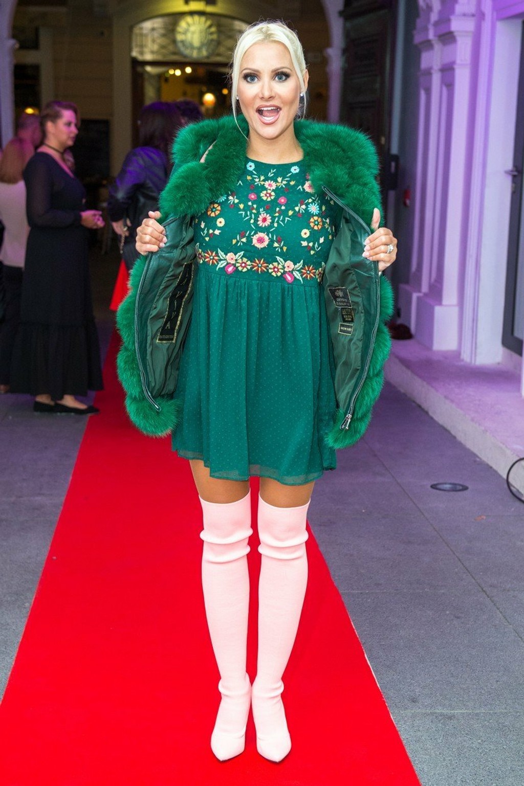 Jana si na červený koberec obliekla slušivé zelené šaty s dlhým rukávom a k nim doladila ružové čižmy nad kolená. Vhodne doladila aj účes a doplnky. Vyzerala perfektne.