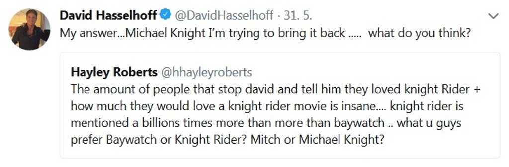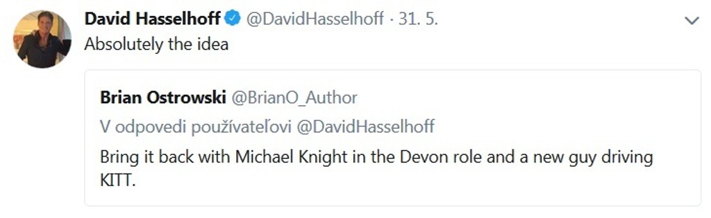V médiách a diskusii s fanúšikmi na sociálnej sieti naznačil, že by sa vôbec nebránil oživeniu legendárneho seriálu Knight Rider a dokonca už niekoľko mesiacov podniká určité kroky, aby sa hovoriace superauto KITT znovu vrátilo do hry.