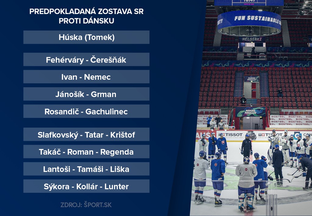 Slovenská hokejová reprezentácia nastúpi v utorok o 15.20 hod na svoj záverečný zápas A-skupiny a verme, že nie posledný na svetovom šampionáte vo Fínsku. V rozhodujúcom súboji o postup do štvrťfinále na našich hráčov čakajú Dáni. Ako píše sport.sk, tréneri už potvrdili zostavu, s ktorou vyrukujeme do nášho zatiaľ najdôležitejšieho zápasu turnaja.