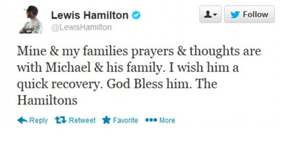 Či už ste na jednej alebo druhej strane, dôležité je, aby sa Michael Schumacher dal do poriadku. Ľudia po celom svete mu želajú skoré uzdravenie a jeho stav prakticky denne pozorne sledujú. Medzi nich určite patrí aj sám Hamilton, ktorý na Twitter umiestnil odkaz vyjadrujúci podporu Schumacherovi i jeho blízkym.