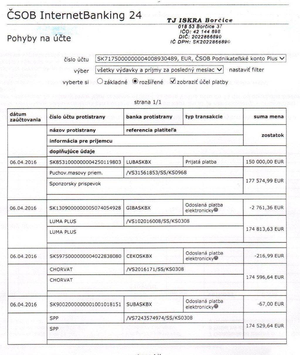 Na klubovej stránke sa objavila aj kópia výpisu z účtu.