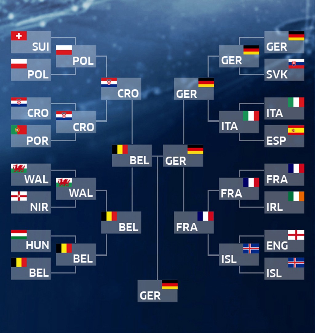 Vo štvrťfinále dajú Chorváti stopku Poliakom, Belgičania svoj výkon vystupňujú a zdolajú Wales, nad sily Talianov budú Nemci a spanilú jazdu Islandu ukončia domáci Francúzi. Tí však pred bránami finále stroskotajú na Nemcoch, ktorí sa vo finále stretnú s Belgickom. To po penaltách pokorí Chorvátsko.