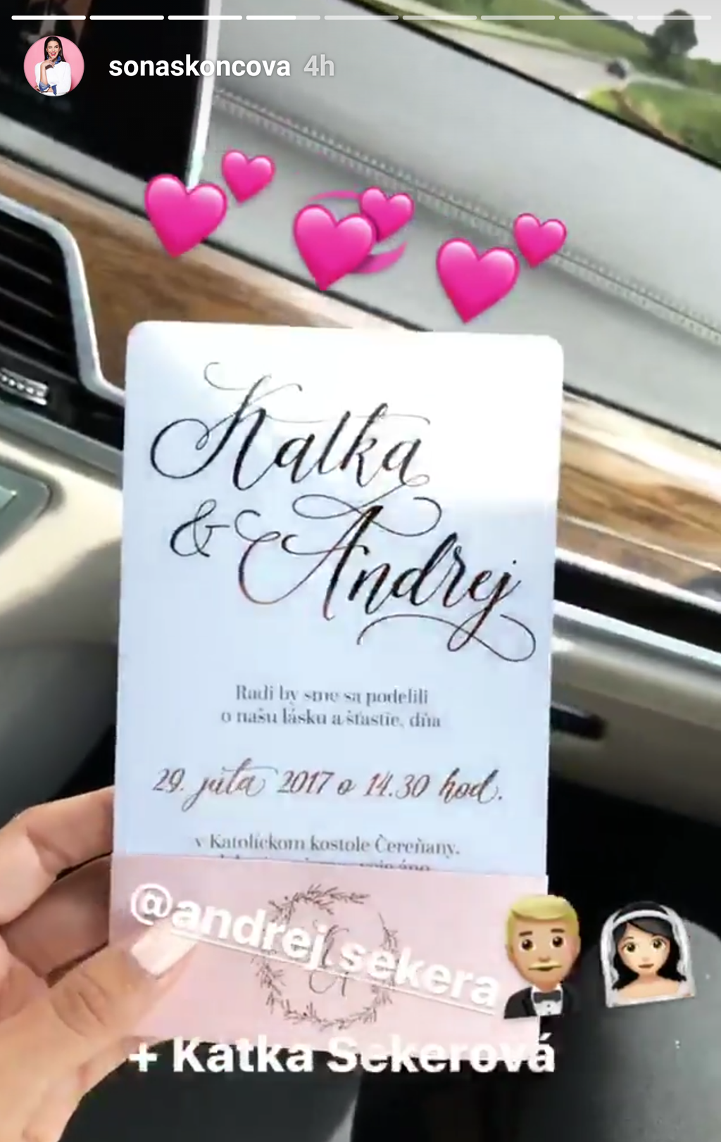S informáciou prišla moderátorka a bývalá modelka Soňa Skoncová. Na Instagrame zverejnila krátke video z auta cestou na svadbu. Na oznámení, ktoré drží v ruke, sa píše: "Radi by sme sa podelili o našu lásku a šťastie dňa 29. júla 2017 o 14.30 hod."