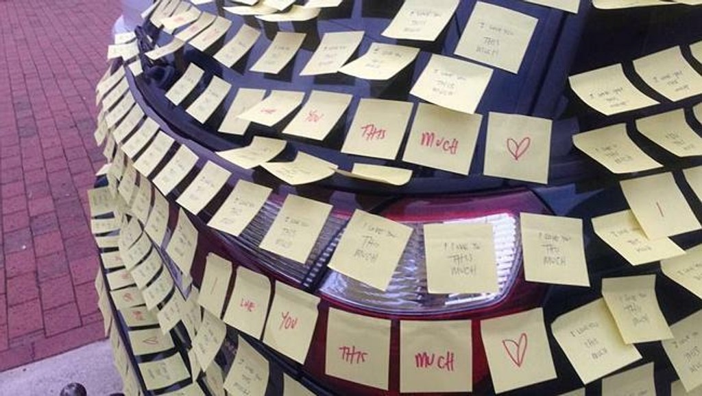 Jej priateľ strávil päť dlhých hodín vypisovaním srdcervúcich vyznaní a ďalšiu hodinu ich lepil na jej auto.