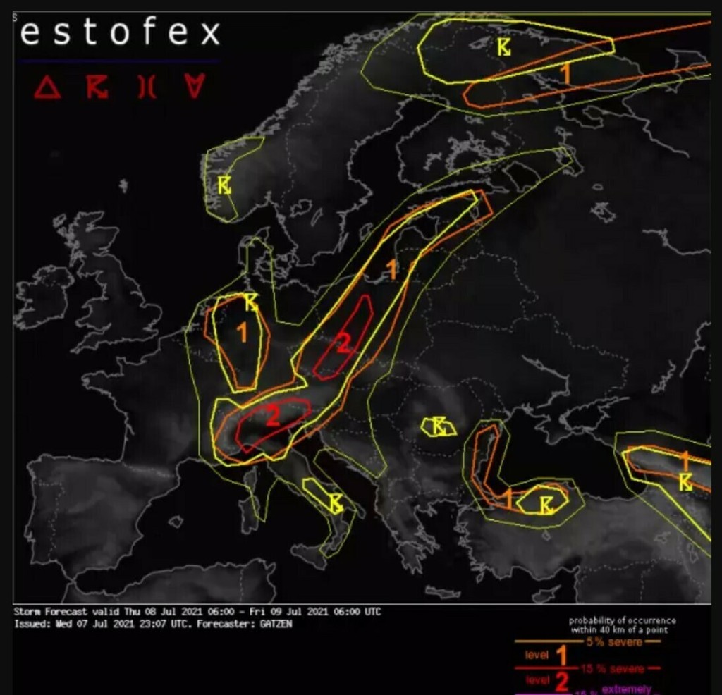 Vytvorí sa výrazný búrkový komplex, ktorý sa bude presúvať ponad Rakúsko, Česko a Poľsko. Prvé búrky by sa mali vytvárať už dnes (8.7.) popoludní a je vysoká pravdepodobnosť, že sa prehĺbia do superciel. Tie zasiahnu hlavne Moravu a severné Rakúsko. Prinesú so sebou výrazné zrážky aj krúpy. Vylúčené nie je ani tornádo. Podmienky sú mierne horšie ako pri tornáde, ktoré sa na Morave vyskytlo na konci júna.