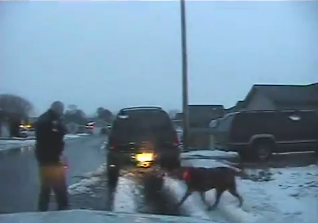 Na videu, ktoré nakrútila kamera z palubnej dosky, je vidieť, ako čivava a dva väčšie psi útočne štekajú na policajta. Ten zrejme zo strachu do jedného z nich kopol a namieril na neho zbraň.