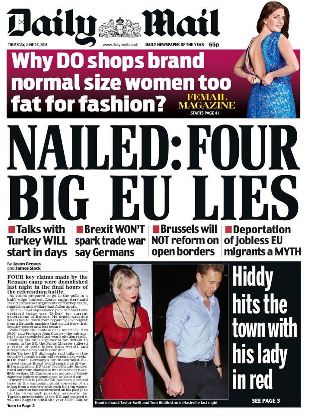 Daily Mail sa priklonil na stranu podporovateľov brexitu a dnes vyšiel s titulkom: „Priklincované: 4 veľké lži EÚ". Hovoria o tajných rokovaniach s Tureckom, zavedení daní na britský tovar, neschopnosti EÚ prijať reformy a argumentujú, že ani jeden migrant ešte nebol deportovaný.
