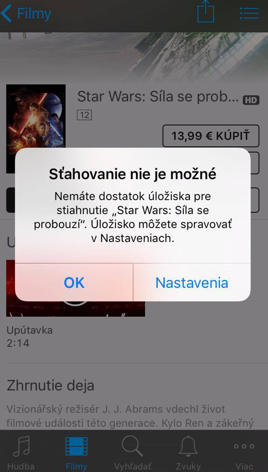 Otvorte si aplikáciu iTunes obchod a choďte do sekcie filmy. Nájdite si nejaký film, ktorý je väčší ako vaše voľné miesto. V našom prípade sme si vybrali Star Wars: Sila sa prebúdza, ktorý má 6,13 GB. Dvakrát kliknite na možnosť požičať. Nemusíte sa báť ceny, Apple si to účtovať nebude, keďže sa mu film nepodarí stiahnuť. Vyskočí vám totiž hláška, že „Sťahovanie nie je možné".